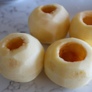 Next work on coring your apples. Having a little melon ball scooper made this super easy. You basically just want to get out of the nasty core that's rough and has seeds.
