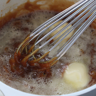 Once its melted, immediately remove from heat. Then, carefully add the butter and whisk until completely melted. (The caramel will bubble up rapidly, so be careful and continue to whisk.)