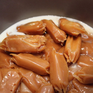 In a small nonstick pot, melt together the caramel candies and heavy cream over low to medium heat. Stir fairly constantly.