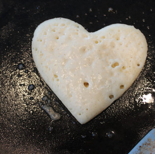 Before you are ready to cook the pancake, turn down the heat to low medium, about a 3. Now that the batter is ready I spread a bit of butter on the pan. Then get my heart cookie cutter and place it over the butter. Side note: My cookie cutter is nonstick, if yours isn’t or you’re not sure, give it a good rub of butter on the inside. You are going to want to pour a very thin layer in the mold. They will rise and they will not cook through if there is too much batter.