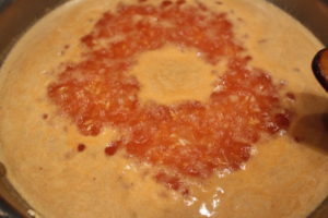 Add in 2 and 1/2 cups of water, 2 tbs of chicken bouillon, and 2 tbs of tomato sauce. Let it come to a boil.