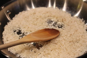 On medium heat, brown your rice in a tbs. olive oil.Â