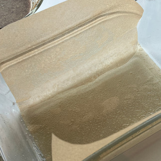 Lastly, stir the wet ingredients into the dry. Line a loaf tin with parchment paper and grease with either butter or a non-stick spray.
