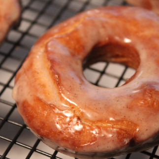 While the doughnuts are still warm, dip the tops into the glaze or spoon glaze over them.