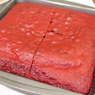 The first thing you want to do is line your pan with parchment paper and spray with nonstick spray or butter. Then mix together your red velvet box cake mix and pop it in the pan. Bake it according to the box instruction and let cool.